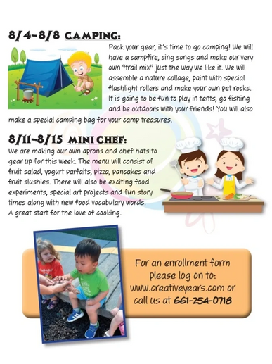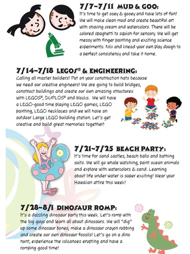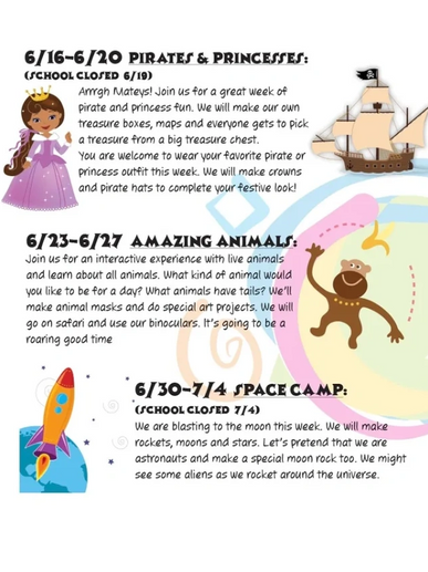 Our weekly themed summer camp offers a safe and fun environment for the children as all "field trips" are brought into our campus. We work on social skills, problem solving and having a great time with friends!